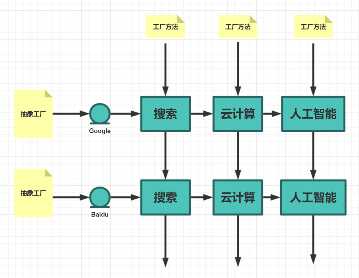 - 【不同产品的替换和组合】如果在项目中后续需求是一个混合产品,例如百度的搜索搭配谷歌的AI和云计算,又或者百度的搜索,谷歌的AI和阿里的云计算,我们只需要新建一个混合工厂,然后添加阿里的云计算即可,原来的“产品”都可以复用。