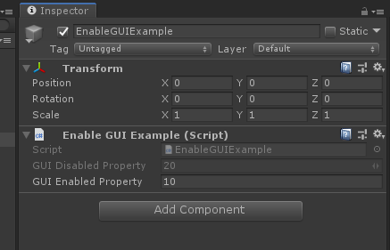 Enable GUIAttribute特性:可以控制只有Get的属性,在Inspector中是否为可灰态的(但是依然不可编辑),不写则默认为灰态。