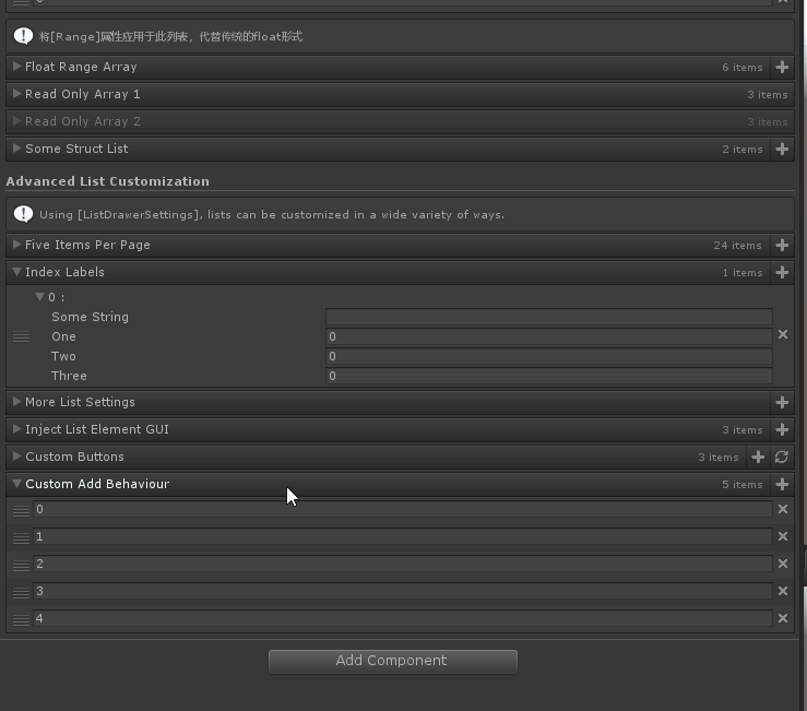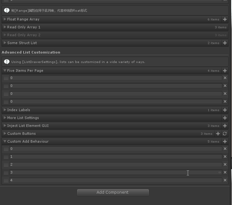 [InfoBox("现在可以拖动列表元素来重新排序并逐个删除它们,并且列表具有分页功能(尝试添加大量元素!)您仍然可以从项目视图一次将许多资产拖到列表中—只需将它们拖到列表本身,并将它们插入到您想要添加它们的地方.")]