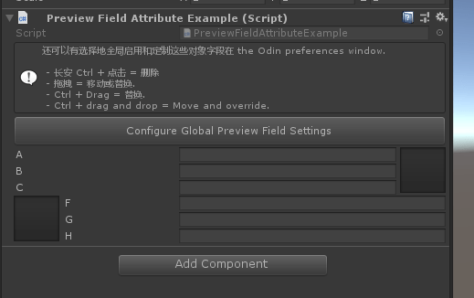 Preview Field Attribute特性:用于绘制一个方形ObjectField,它呈现UnityEngine.Object类型的预览。此对象字段还添加了对拖放的支持,将对象拖动到另一个方形对象字段,交换值。如果在放开时按住控制它将替换值,并且您可以Ctr+单击对象字段以快速删除它保存的值。