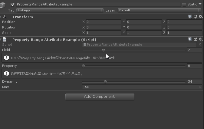 Property Range Attribute:属性创建一个滑块控件,以将属性的值设置在指定范围之间。这等效于Unity的Range属性,但是此属性可以同时应用于字段和属性。