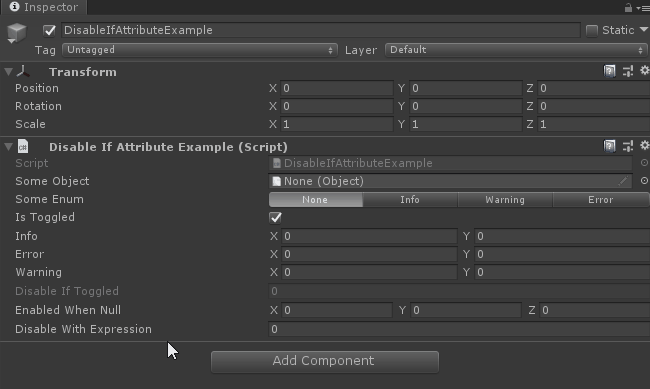 Disable If Attribute:用于任何属性,并且可以在检查器中启用或禁用该属性。相关属性时,使用此选项可禁用属性。