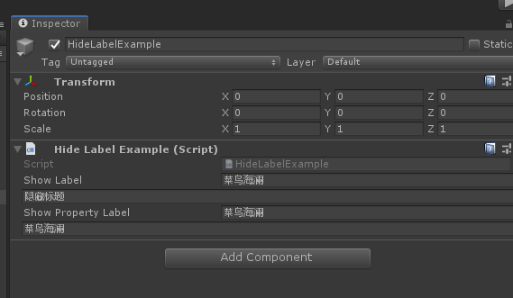 Hide Label Attribute特性:用于任何属性,并在Inspector中中隐藏标签。使用此选项可隐藏Inspector中的属性标签。