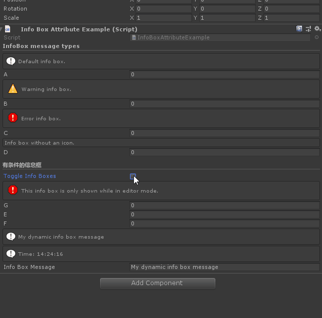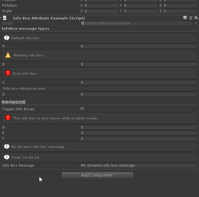 Info Box Attribute:可用于任何属性,并在检查器中在属性上方显示一个文本框。使用它来添加注释或警告使用不同的属性。